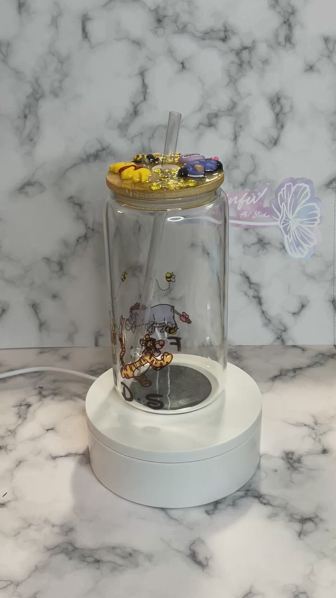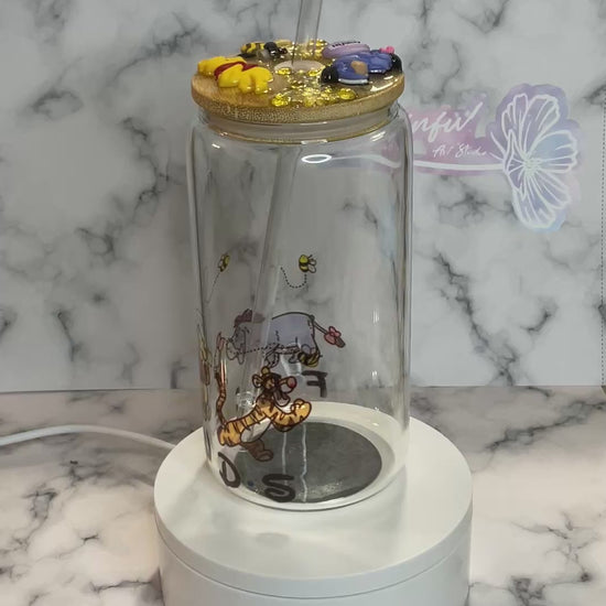 16 oz. Glass cans . These beautiful glass cans come with bamboo lids, glass straws, and an anti slip rubber bottom.